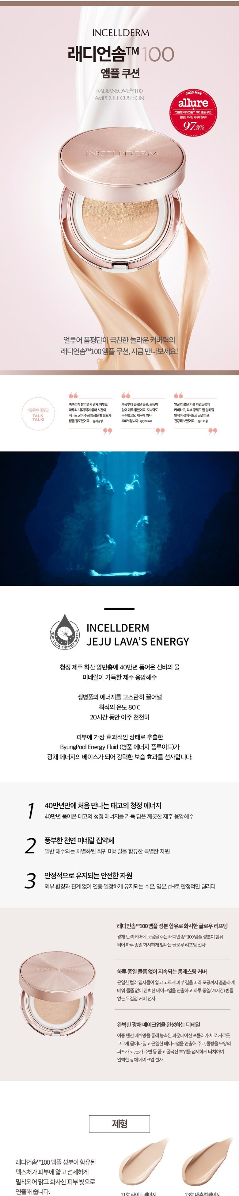 인셀덤 쿠션은 래디언스 코튼 100 앰풀 쿠션으로 SPF50+ PA+++ 21호 라이트네이지가 인기가 가장 많습니다.